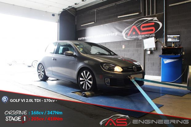 Reprogrammation moteur VOLKSWAGEN GOLF VI 2.0L TDI de 168 cv à 205 cv et augmentation du couple de 347 Nm à 418 Nm