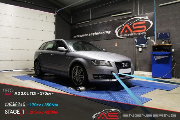 Digiservices sud ouest Reprogrammation moteur AUDI A3 2.0 TDI de 170 cv à 205 cv et augmentation du couple de 350 Nm à 420 Nm
