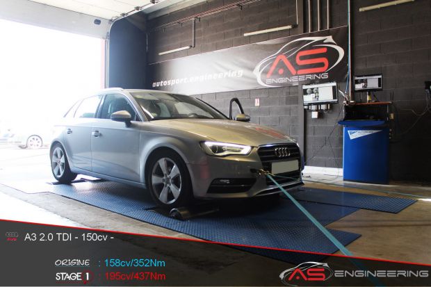 Digiservices Sud Ouest Reprogrammation moteur AUDI A3 2.0 TDI de 158 cv à 195 cv et augmentation du couple de 352 Nm à 437 Nm