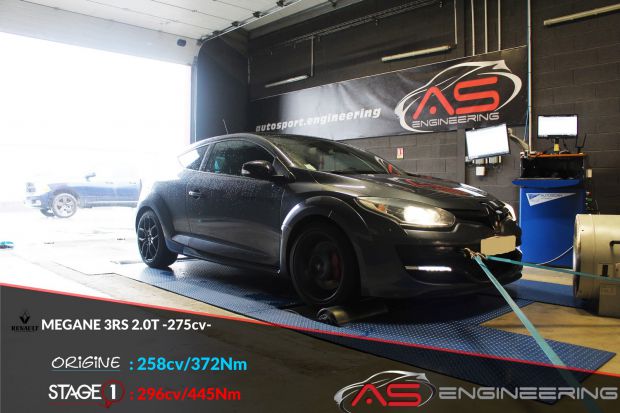 Digiservices Sud ouest Reprogrammation moteur RENAULT MEGANE 3RS 2.0T de 258 cv à 296 cv et augmentation du couple de 372 Nm à 445 Nm